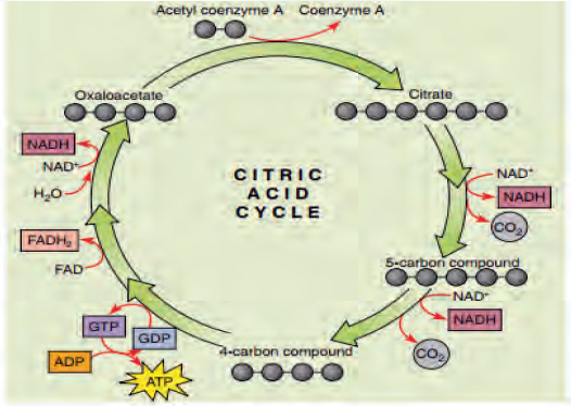 The Krebs cycle itself actually begins when acetyl-CoA combines with a four-carbon molecule called OAA (oxaloacetate) (Figure 28). This produces citric acid, which has six carbon atoms. This is why the Krebs cycle is also called the citric acid cycle. After citric acid forms, it goes through a series of reactions that release energy. The energy is captured in molecules of NADH, ATP, and FADH2, another energy- carrying compound. Carbon dioxide is also released as product of these reactions. The final step of the Krebs cycle regenerates OAA, the molecule that began the Krebs cycle. This molecule is needed for the next tum through the cycle. Two turns are needed because glycolysis produces two pyruvate molecules when it splits glucose.