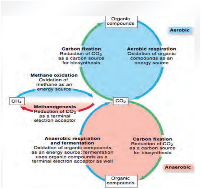 In anaerobic environments, CO2 is used by methanogens. These archaea obtain energy by oxidizing hydrogen gas, using CO2 as a terminal electron acceptor, generating methane (CH4). Methane that enters the atmosphere is oxidized by ultraviolet light and chemical ions, forming carbon monoxide (CO) and CO2. A group of microorganisms called methylotrophs can use methane as an energy source, oxidizing it to produce CO2 showed in figure 16.