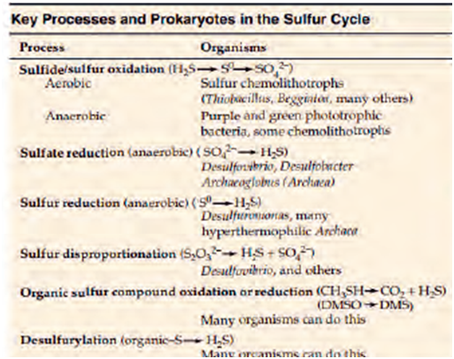 Sulfur is found in fewer types of organic molecules than nitrogen, but it is found in many proteins. Figure 17 shows the bacteria involved in the sulfur cycle and the roles they play.