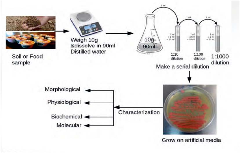 Microorganisms (bateria or fungi) can be isolated from food, soil, water or from other materials. For bacterial/fungal isolation, the soil (food) samples are collected from the desired sites (Figure 18). Microorganism are separated on artificial media by serial dilution method. Each of the isolates are purified on new media and experimented for the morphological characteristic like shape, gram nature and arrangement of cells, motility etc. Enzymatic activities were tested by biochemical characterization. Finally, molecular techniques are used for further identifications.
