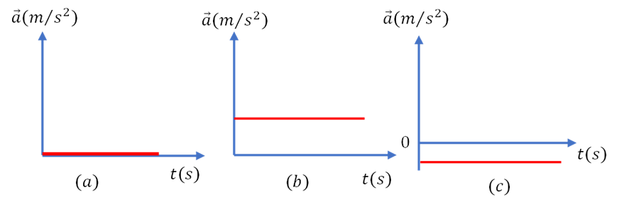 Figure 3.6 acceleration-time graph of (a) uniform motion, (b) uniformly accelerated motion, (c) uniformly decelerated motion.