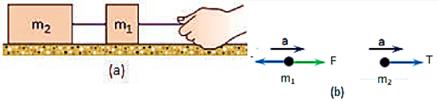 Two blocks of identical materials are connected by a light string on a level surface (Figure 4.25). Assuming no friction between the blocks and the level surface, find the acceleration of the masses and the tension in the connecting string when the string attached to m is pulled to the right by a 36 N force. Use m = 4 kg and m = 8 k