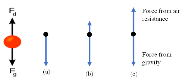Figure 3.7 A free body diagram shows the forces on a particle at different times during its fall: (a) at the start of the fall; (b) during the fall; (c) at the end of the fall.