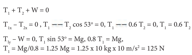 Mass m= 10kg is supported by two strings is in equilibrium as shown in Figure 4.34. Find the tension in the horizontal string. Take θ = 53o