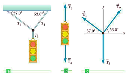 A traffic light weighing 100 N hangs from a vertical cable tied to two other cables that are fastened to a support, as in Figure 4.33a. The upper cables make angles of 37° and 53° with the horizontal. Find the tension in each of the three cables
