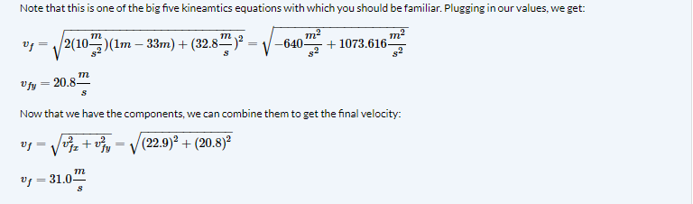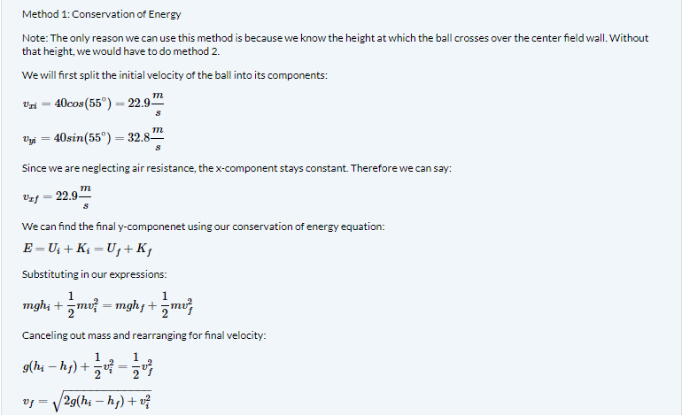 For a baseball field, the distance between home plate and the center field wall is about 123m and the wall is 5m tall. If a player hits the ball at a level of 1m off the ground, an angle of 55∘ above the horizontal, and a velocity of 40m/s, what is the total velocity of the ball as it passes over the center field wall at a height of 33m?