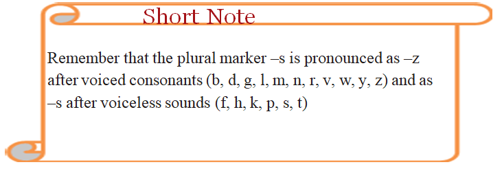 -Remember that the plural marker –s is pronounced as–s after voiceless sounds (f, h, k, p, s, t)