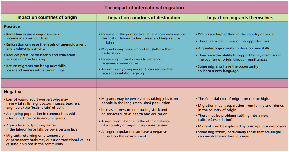 - Describe the positive and negative impacts of migration both to the country of origin and country of destination.