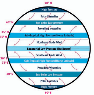 Dear Online Learner! Because the Subtropical High Pressure (STH) is the source of surface westerlies, the seasonal migration of the STH has climatic implications. The STH about 300 latitude, according to the general circulation model, pulls surface air toward the pole and equator. The inter-tropical convergence zone (ITCZ) is located in low-pressure zones that receive the most heat from the sun. Rising motions of trigger clouds and precipitation-forming processes connected with thunderstorm weather are triggered by the convergence of winds into a low-pressure center or cyclone.