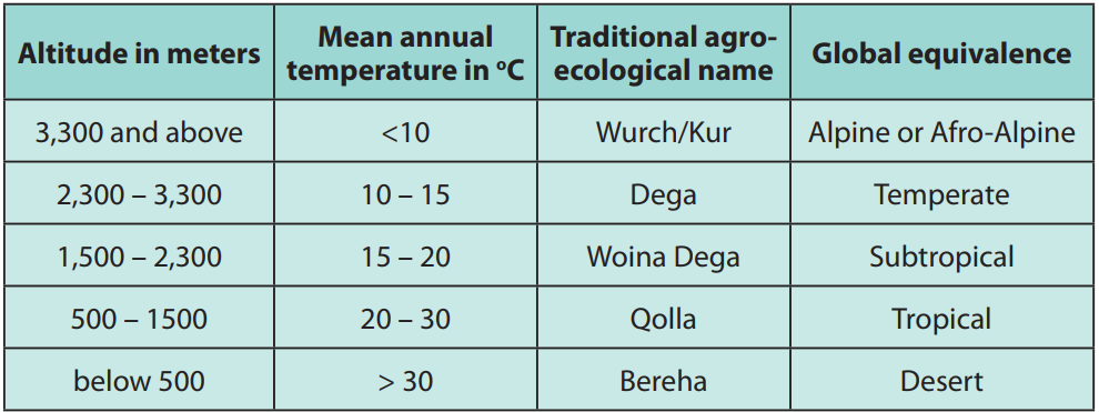 Dear Online Learner! Ethiopia’s local climate classification is based on height, temperature, and growing season length. The country can be divided into five primary climatic zones: