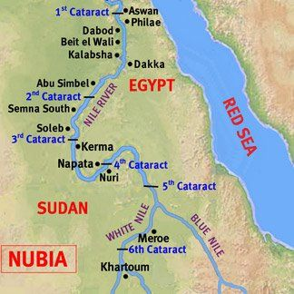 Nubia is a region in Africa stretching from southern Egypt to present-day Sudan, beyond the Nile’s sixth cataract. Similar to Egypt, Nubia was divided into upper and lower regions and inhabited along the Nile. Unlike Egypt, southern Nubia had a more humid climate, allowing farming beyond or out of the Nile valley.
