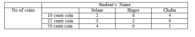 Three students Selam, Hagos and Chaltu have a number of 10, 50 and 25 cents coin in their pocket. The following table shows what they have: