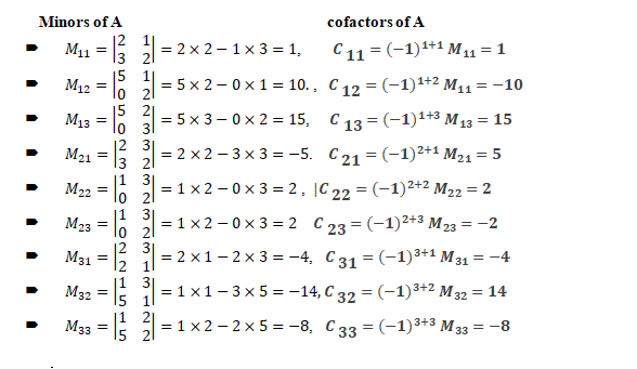 1.Let A = $\begin{pmatrix}1&2&3\\5&2&1\\0&3&2\end{pmatrix}$ then find the minors and cofactors of A?