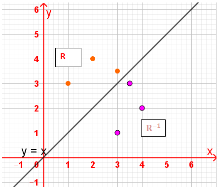 a. the inverse of R is denoted by :$<span id="MathJax-Element-38-Frame" class="mjx-chtml MathJax_CHTML" tabindex="0" data-mathml="<math xmlns="http://www.w3.org/1998/Math/MathML"><merror><mtext>R^{-1} = \ \ {(3,1),(4,2),(3,3)\}</mtext></merror>$R^{-1} = \ \ {(3,1),(4,2),(3,3)\}