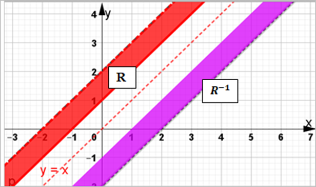 - c. $R = \ \{(x,y): x,y \in \mathbb{R}, y < x+2 and y \ge x+1\}$